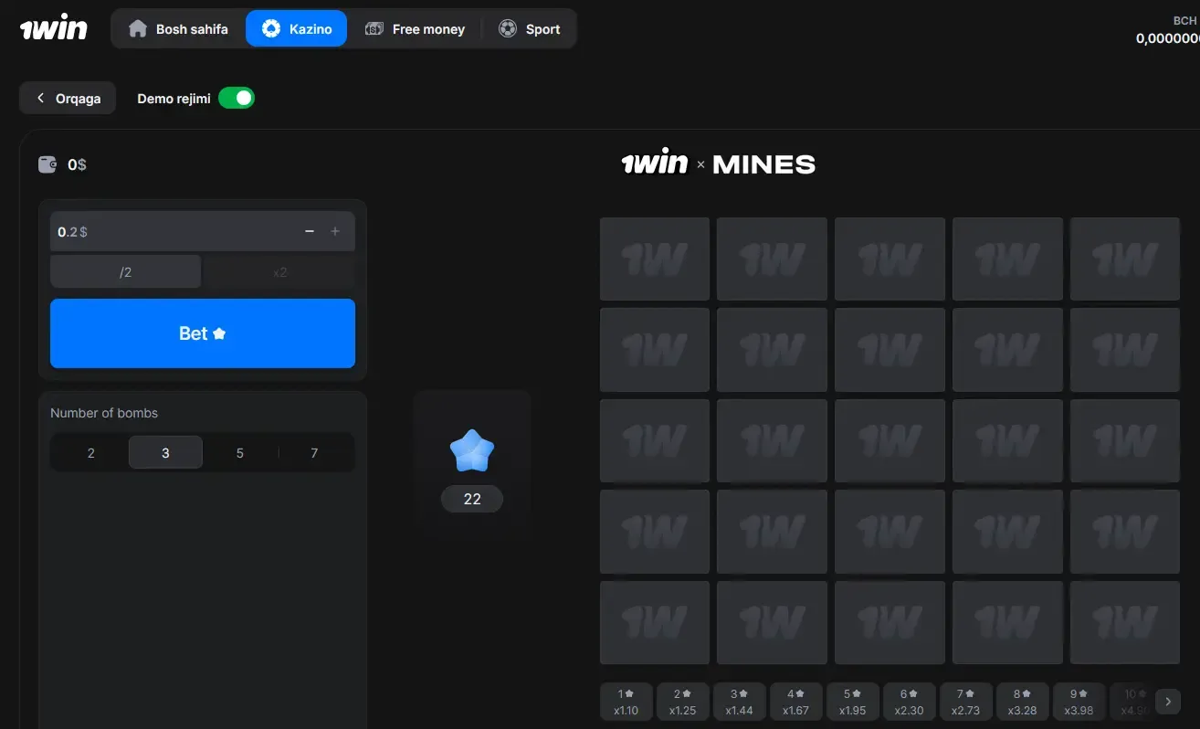 1Win saytida Mines uchun minimal stavka miqdori qancha?