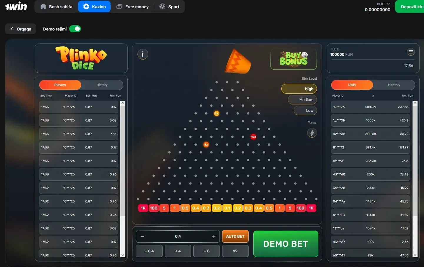1Win oтАЩzbekistonlik oтАЩyin ishqibozlariga Galaxsys kompaniyasidan Plinko Dice oтАЩyinini taqdim etadi тАУ bu klassik Plinko mexanikasini kub asosidagi oтАЩyin va ilgтАЩor fizika simulyatsiyasi orqali qayta ixtiro qiluvchi inqilobiy turbo oтАЩyin. Ushbu ajoyib oтАЩyin 136 ta strategik tarzda joylashtirilgan qoziqlar bilan 16 qatorli ulkan piramida tuzilmasiga ega boтАЩlib, kublar oldindan aytib boтАЩlmaydigan tarzda toтАЩsiqlar orqali pastdagi 17 ta koтАЩpaytiruvchi zonaga tushadi. 98.5% gacha yuqori RTP koтАЩrsatkichlari, oтАЩzgaruvchanlikni nazorat qiluvchi uchta sozlanishi mumkin boтАЩlgan xavf darajalari, 2,500 soтАЩmdan 2,000,000 soтАЩmgacha gacha tikish diapazoni va 1000x ga yetadigan maksimal koтАЩpaytiruvchi potentsial bilan Plinko Dice oтАЩzining noyob 8 bosqichli bonus funksiyasi orqali 128 tagacha bir vaqtda kub tushishlarini namoyish etuvchi maftunkor vizual qoniqish va strategik chuqurlikni taqdim etadi.