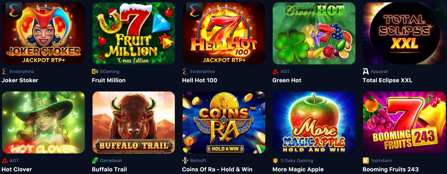 Barcha slotlar yuqori sifatli grafikaga, oddiy boshqaruvga va bepul demo-versiyalarga ega. OтАШyinchilar avval avtomatlarni xavfsiz tarzda sinab koтАШrishlari mumkin, keyin esa haqiqiy pulga oтАШynashga oтАШtishadi.