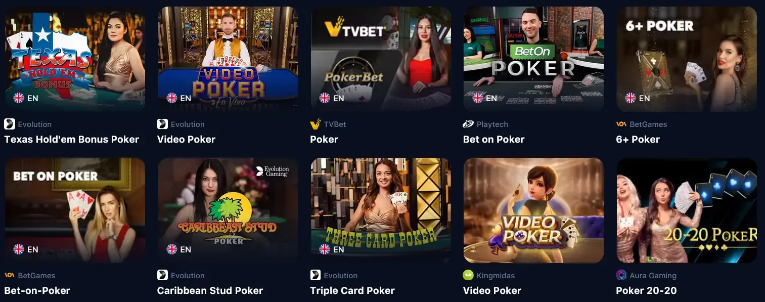 1Win onlayn kazino boтАШlimida Poker ixlosmandlari uchun koтАШplab turli xil poker oтАШyinlari taqdim etilgan. Har bir poker ishqibozi oтАШziga mos oтАШyin variantini topishi mumkin, boтАШlsin u klassik video pokerlar, progressiv jekpotli oтАШyinlar yoki yangi innovatsion oтАШyinlar.