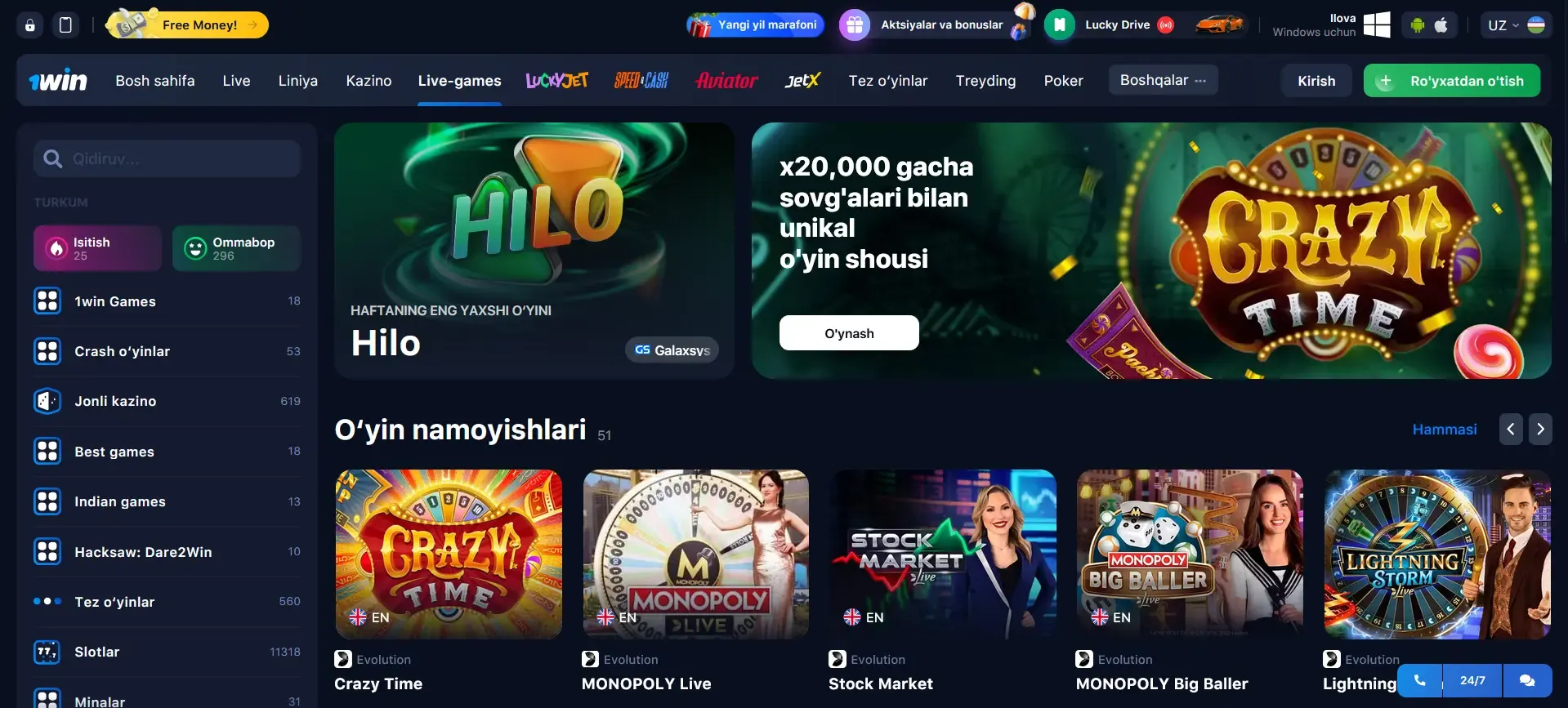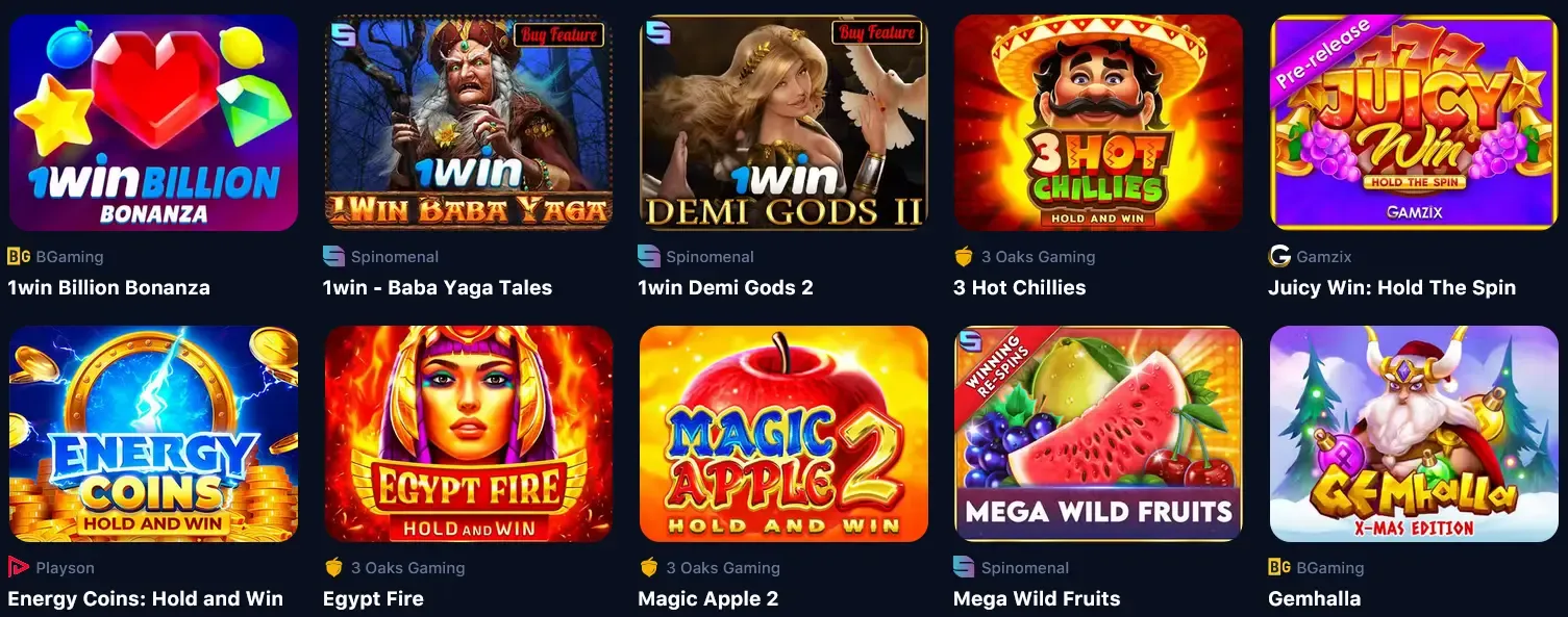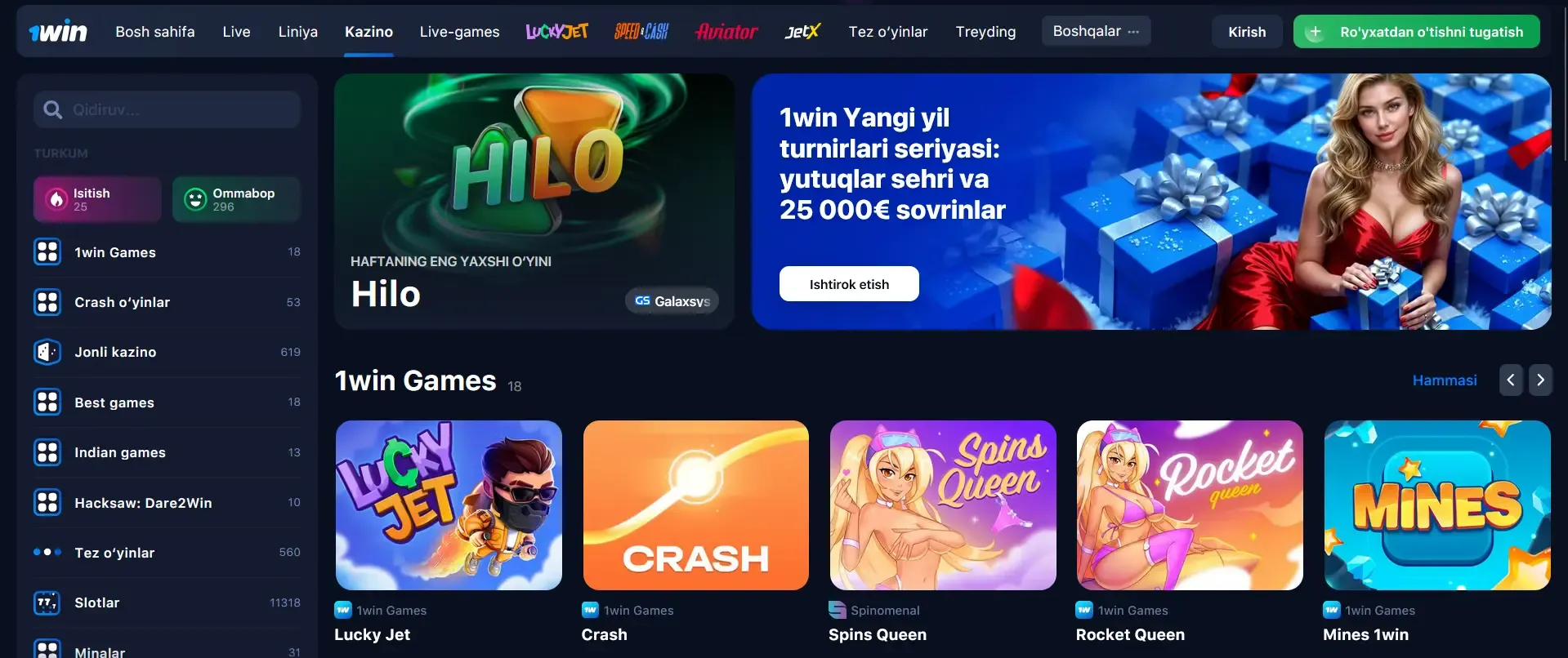 1Win-da keng turdagi o'yinlar mavjud: slotlar, stol o'yinlari (ruletka, blackjack, poker), jonli dilerlar bilan live-kazino, kra┼Я o'yinlari (Aviator, Lucky Jet) va 1Win Games bo'limidagi o'ziga xos mini-o'yinlar.