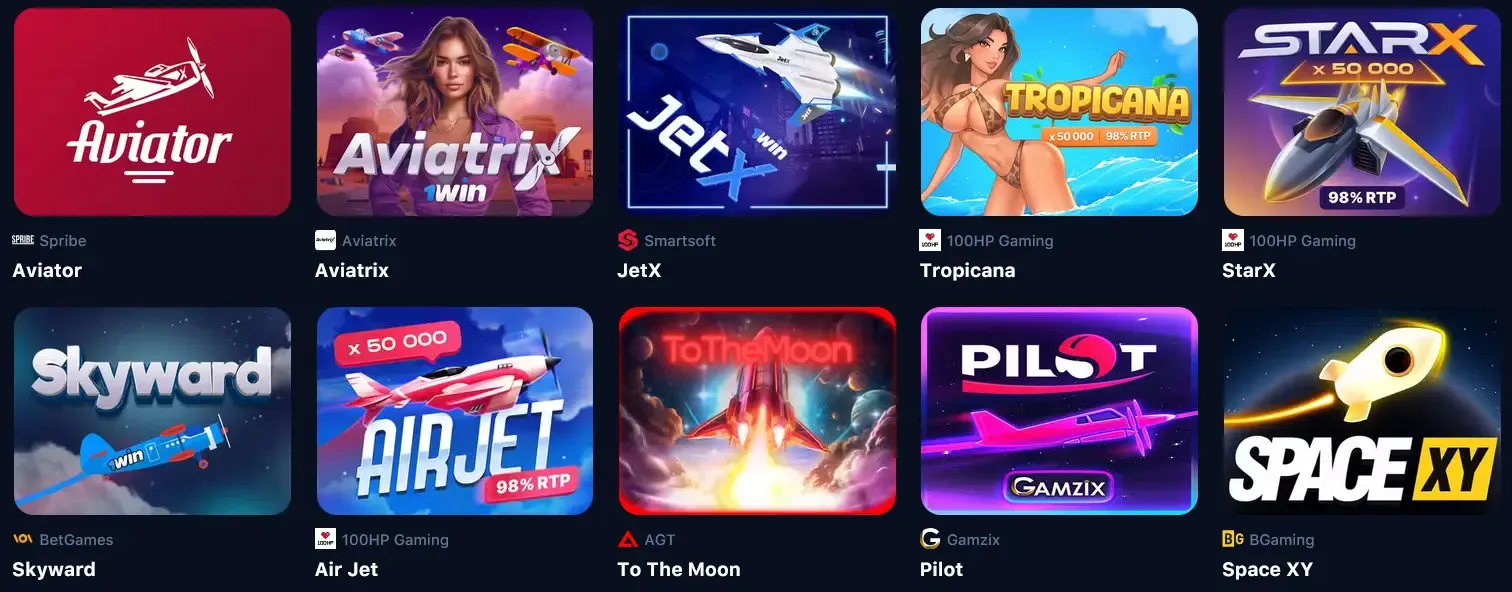 Shuningdek, 1Win dagi krash oтАШyinlar boтАШlimida Tropicana, Aviatrix, FlyX, JetX, Scyward, Iron Dome, To the Moon, Meta Crush, Gogo Rise, va Pilot kabi boshqa qiziqarli oтАШyinlar ham mavjud.