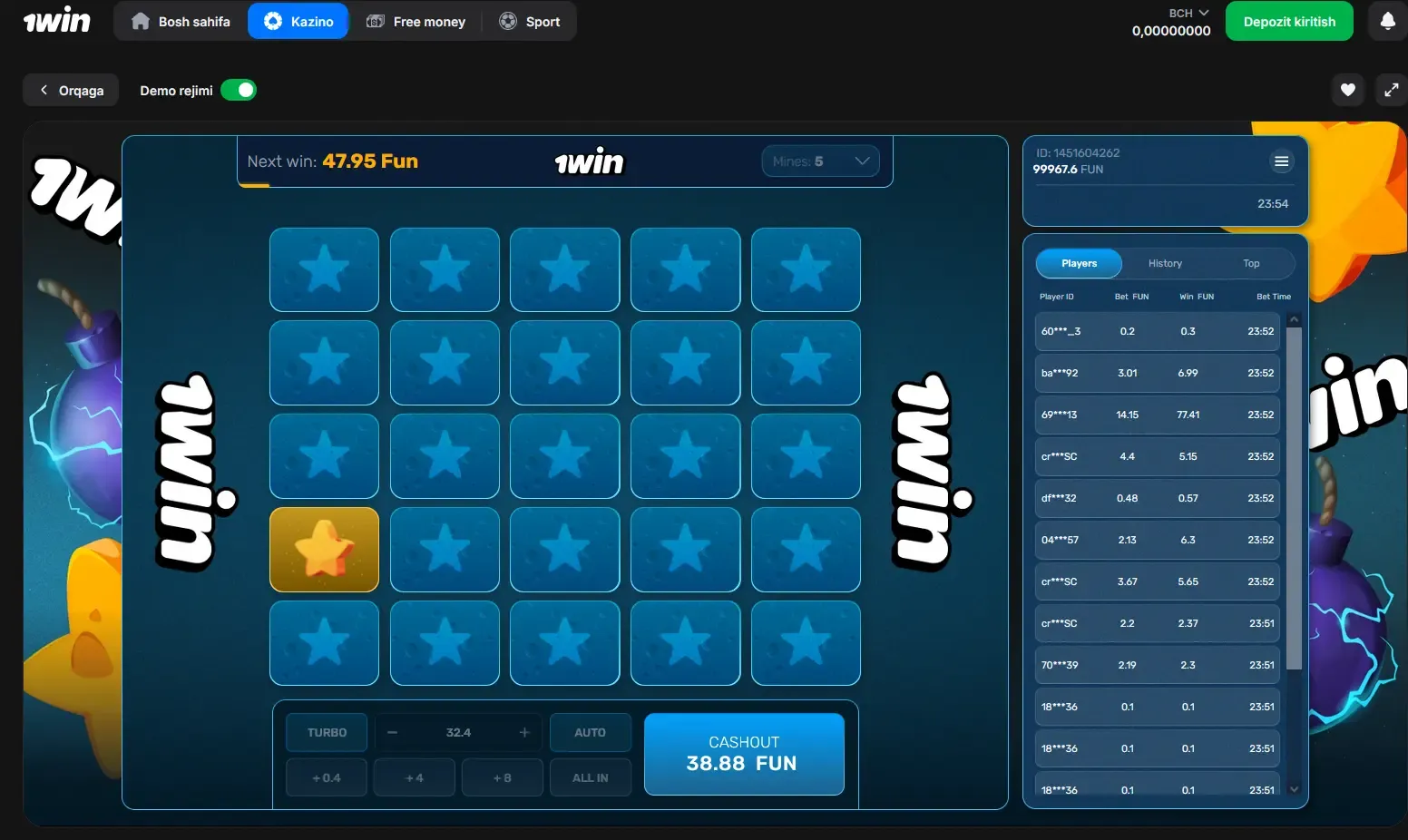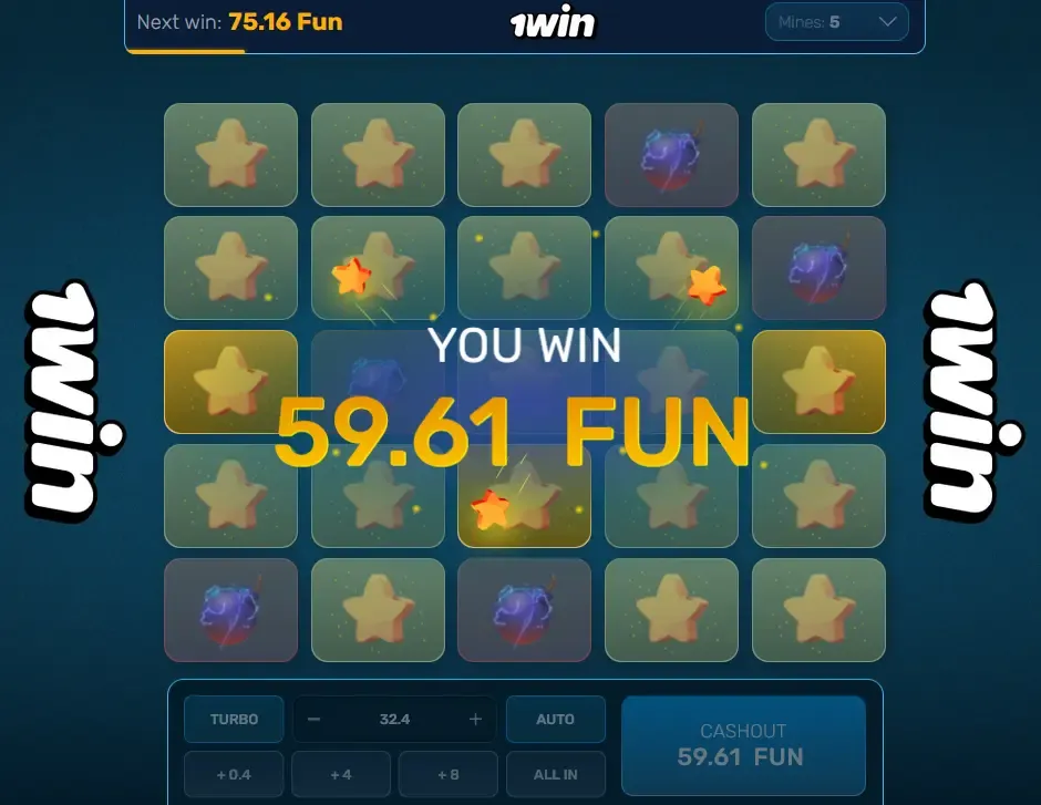 1Win oтАЩzbek oтАЩyin ishqibozlariga Turbo Mines bilan ajoyib imkoniyat taqdim etadi тАУ bu Galaxsys kompaniyasining innovatsion crash-uslubidagi oтАЩyini boтАЩlib, klassik mina qidiruv konsepsiyasini yuqori stavkali sarguzashtga aylantiradi. Turbo Games toтАЩplamidan ushbu noyob mahsulot sizni 25 katagdan iborat tarmoqda harakatlanishga, yulduz belgilarini ochishga va minalardan qochishga chorlaydi. 93% dan 98.89% gacha boтАЩlgan oтАЩyinchiga qaytish koтАЩrsatkichi, 1 dan 24 gacha minalarni joylashtirish orqali toтАЩliq nazorat va x72,000,000 gacha maksimal koeffitsiyent bilan Turbo Mines har bir tanlov ajoyib gтАЩalabalar yoki darhol raund tugashiga olib kelishi mumkin boтАЩlgan betakror hayajon taqdim etadi.
